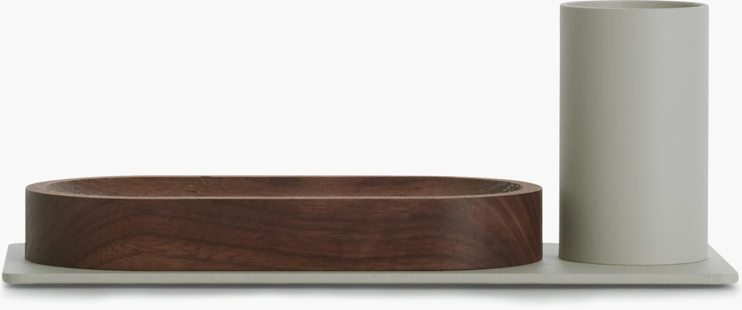 - Combines powder-coated steel pencil cup and wood tray.