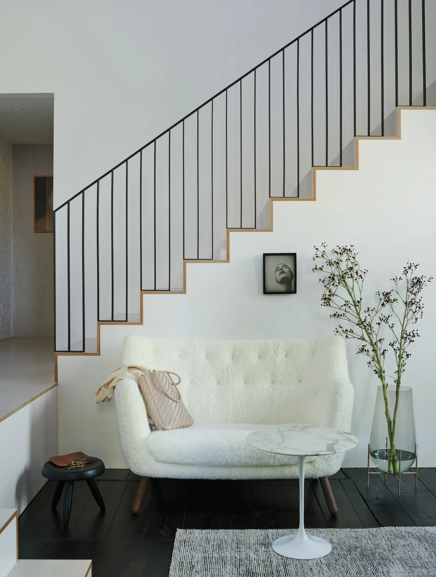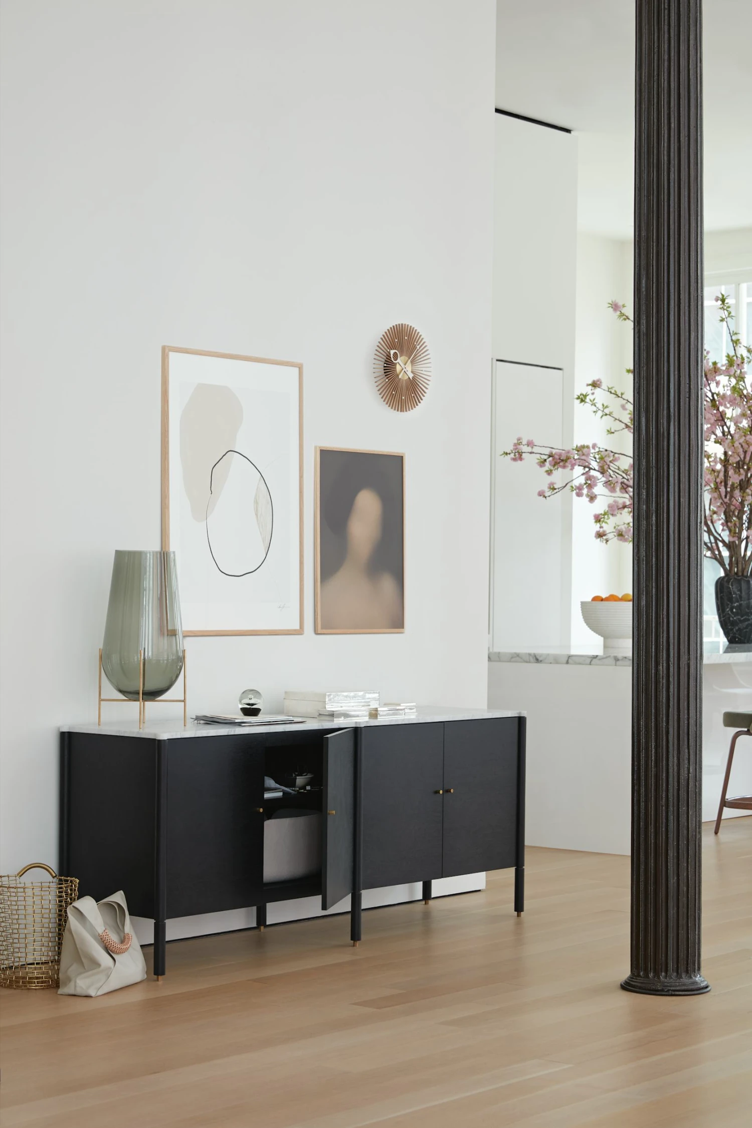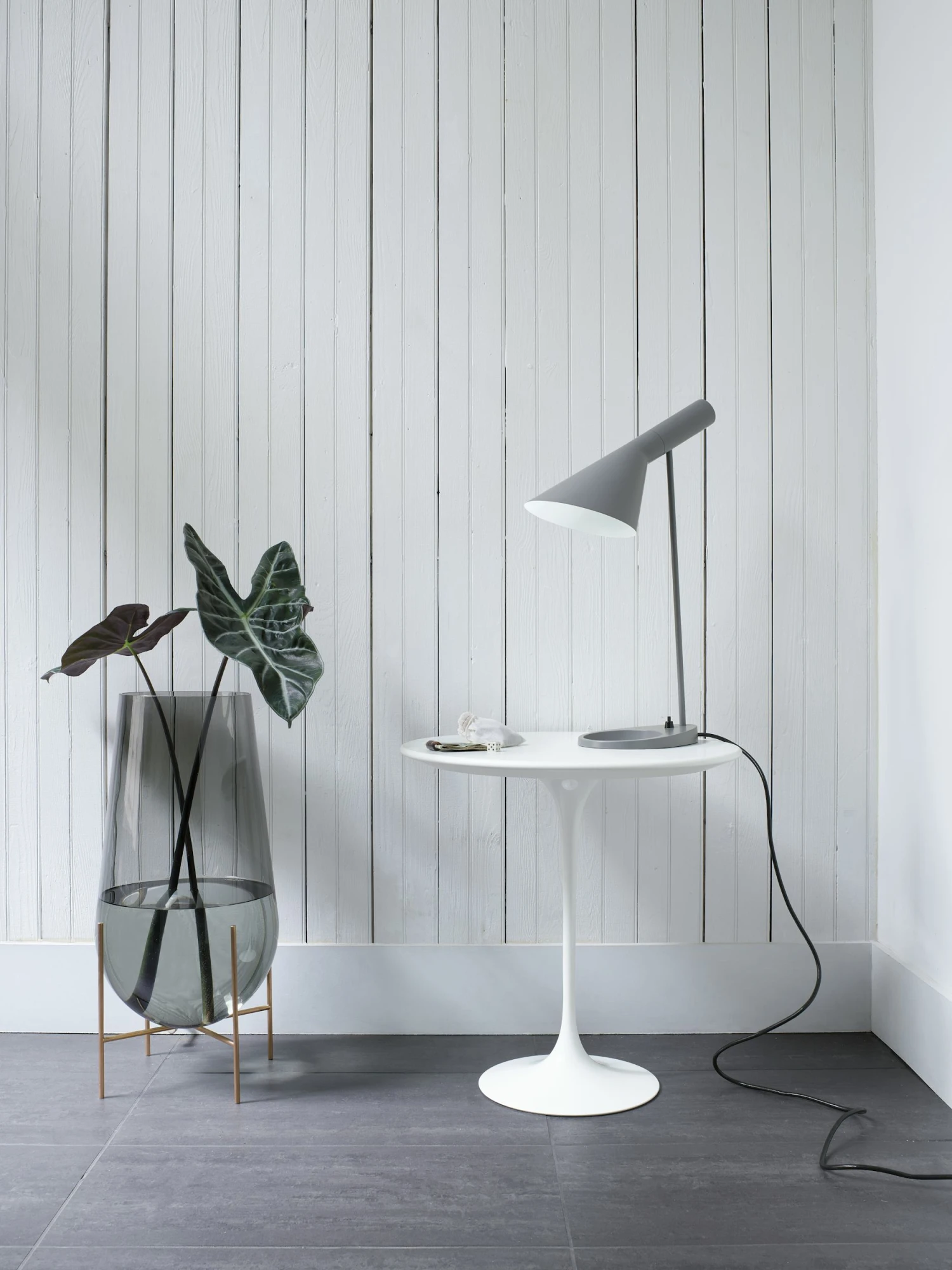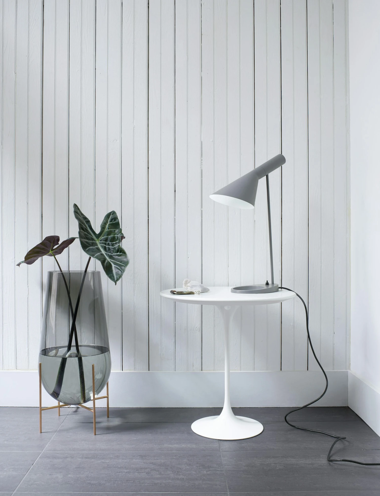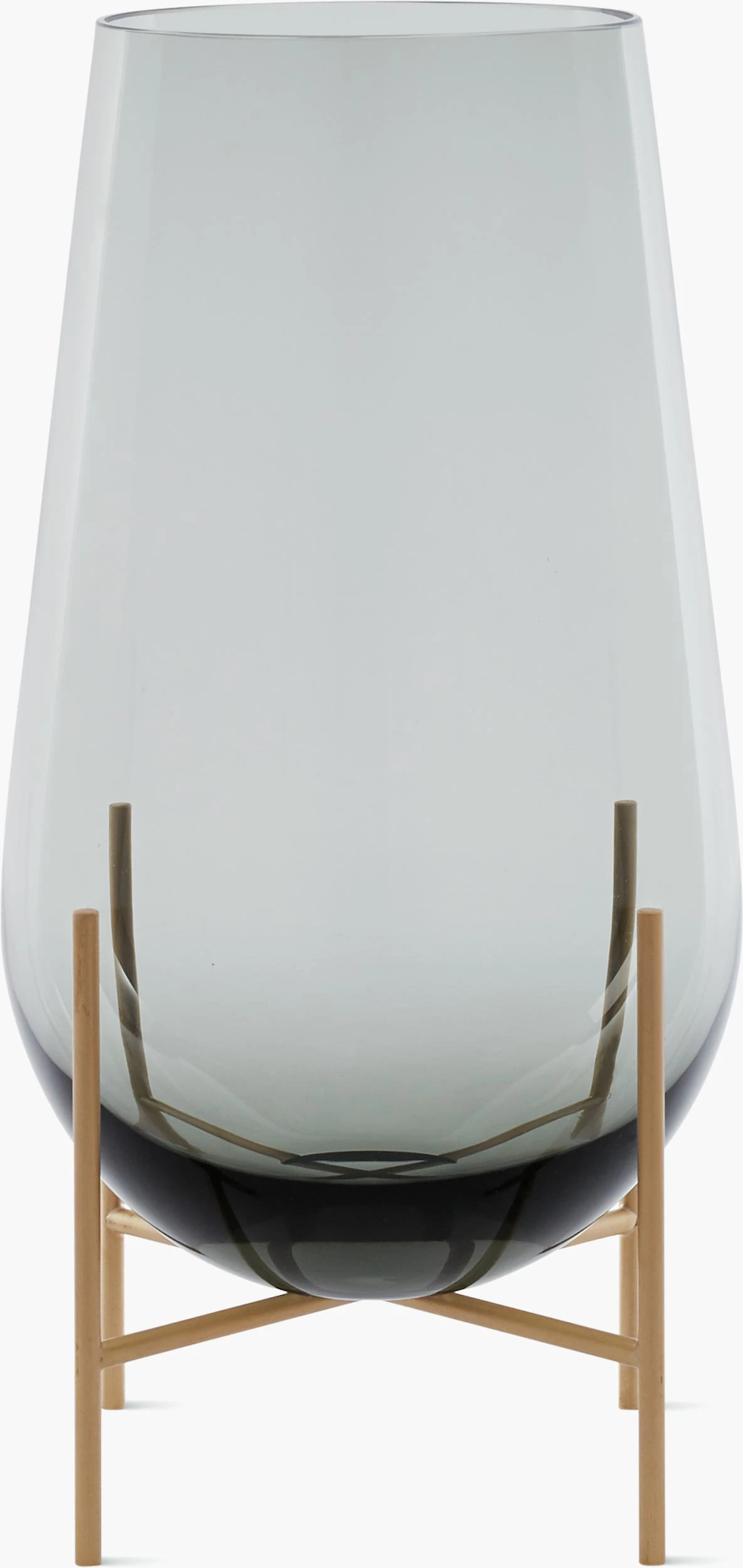 Inspired by test tubes, the glass form of the Échasse Vase (2017) is anchored by brushed brass bases that resemble stilts or échasses in French. Each vase is mouth blown in a steel mold. Made in China.