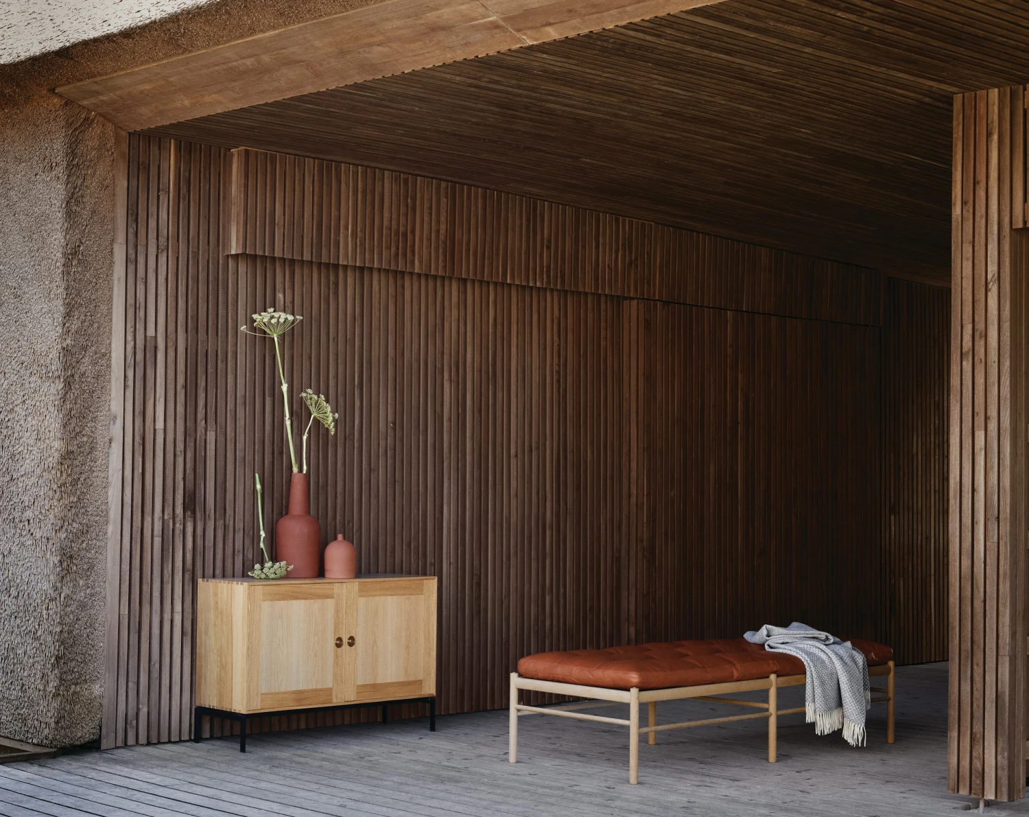 - Contrasts warm and cool materials.