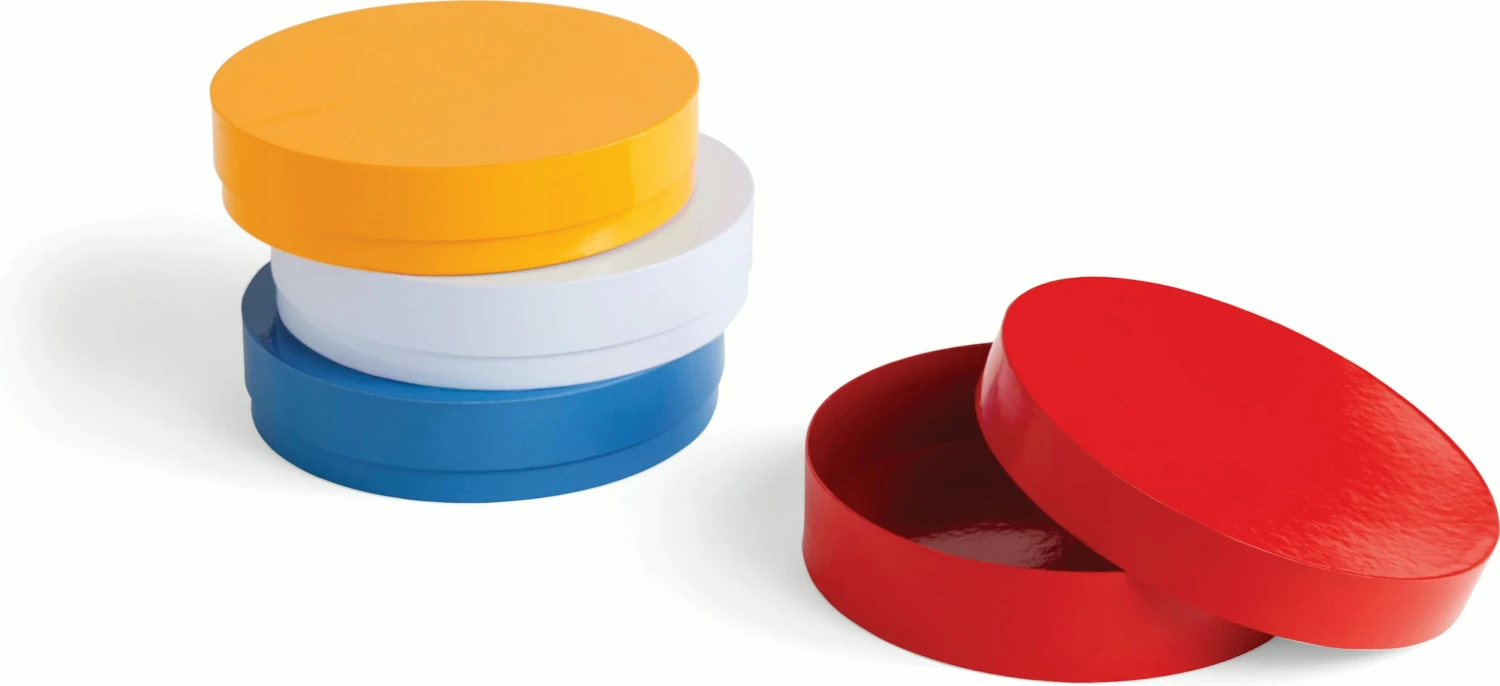 Colour Storage (2022) is a versatile and decorative system of containers that can be used individually for organizing or in multiples for a striking statement. Made of durable, extra-thick cardboard with a glossy finish, these stackable containers can be mixed and matched to suit your personal storage needs. A magnet holds the top securely closed. Ships flat, easy assembly required.