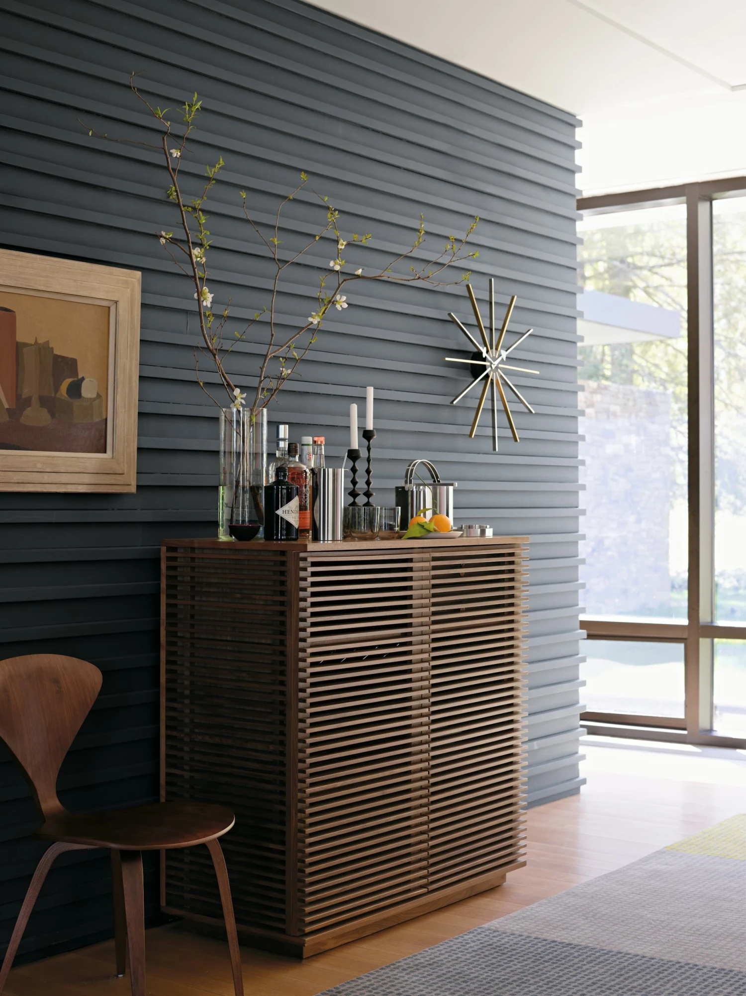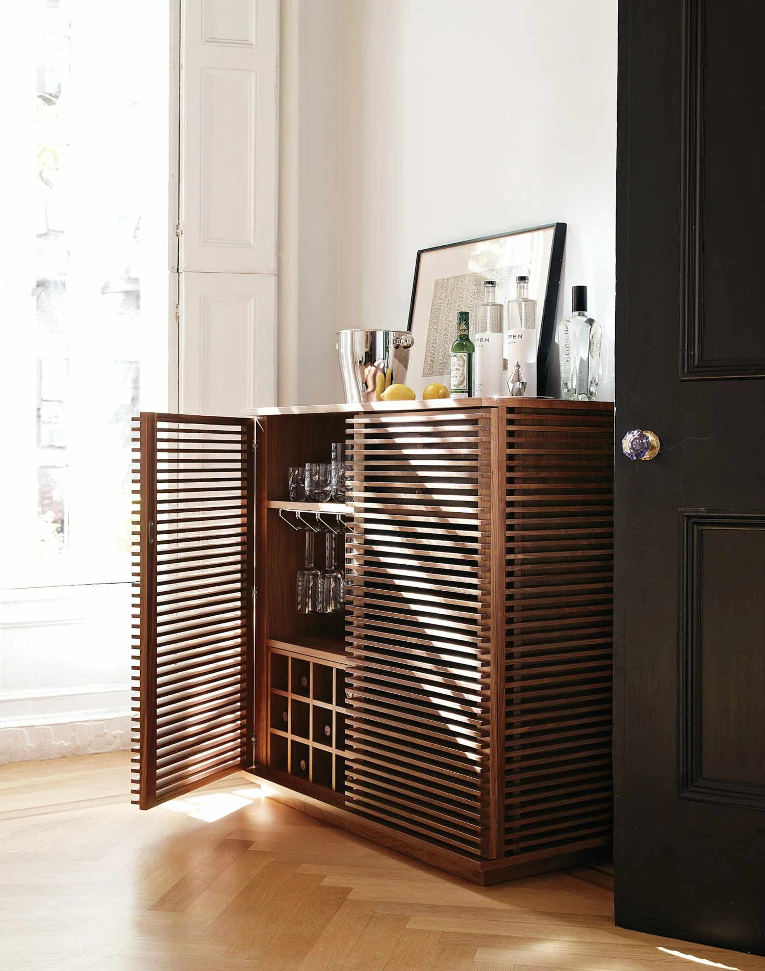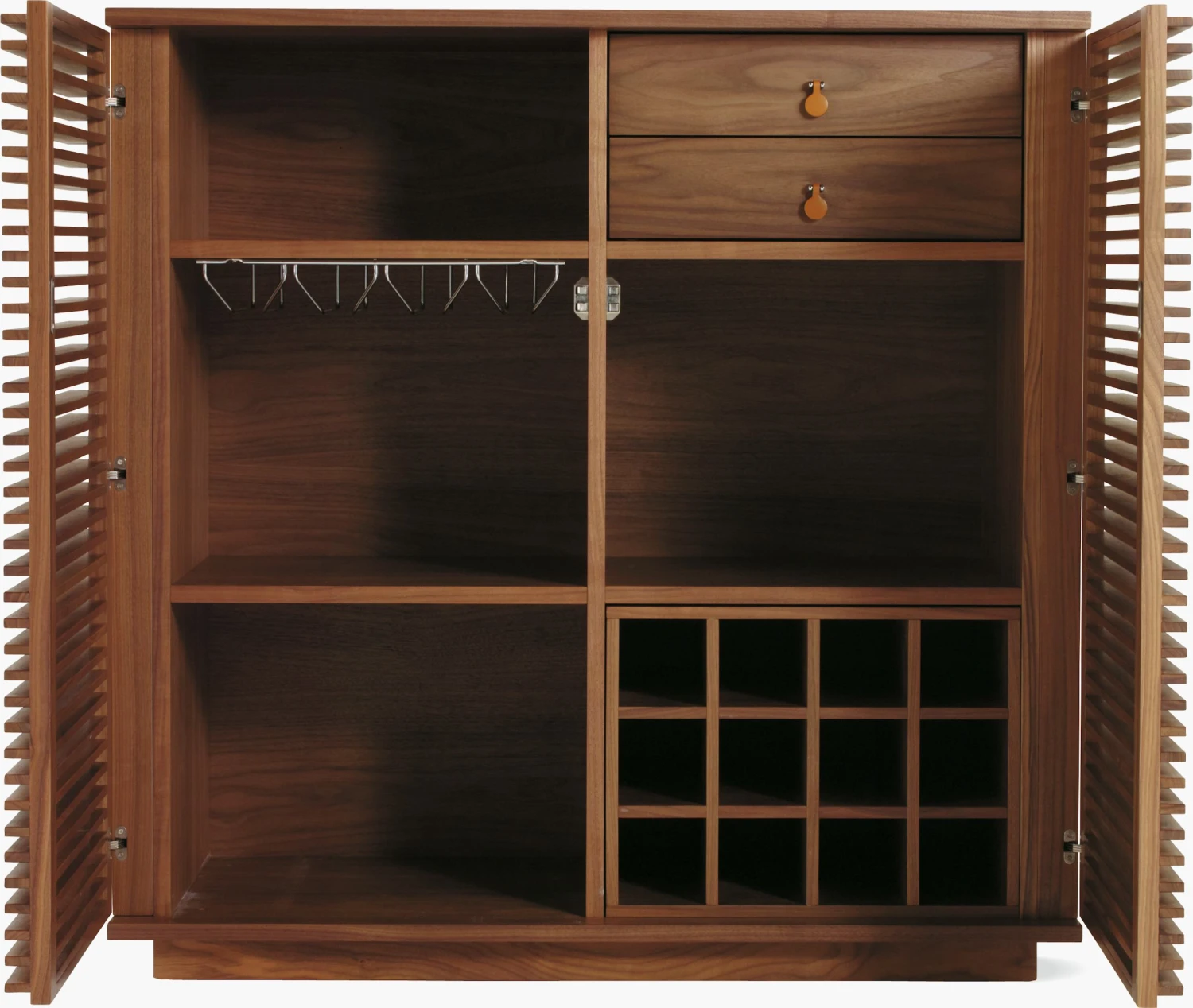 - Two drawers with leather pulls, three cubbies, stemware rack, and bottle rack.
