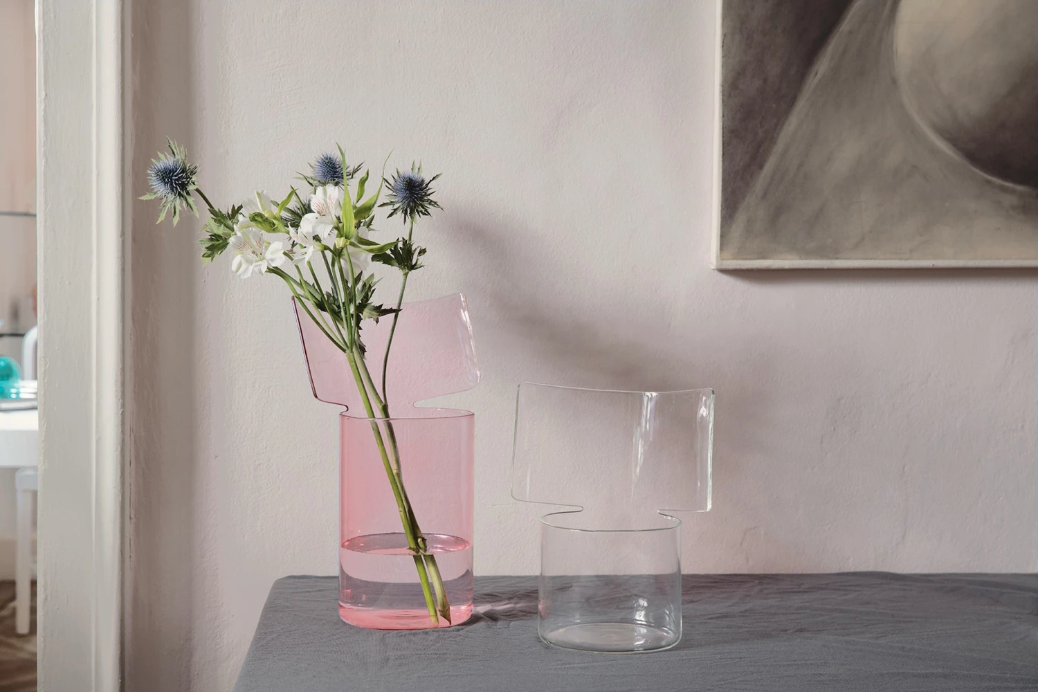 Designed by the Milan-based studio Böjte-Bottari, the Riflessi Vase Collection (2017) offers a contemporary take on Venetian glass to complement floral arrangements from a single bud to a tall display. Artisans mouth-blow the vessels from transparent borosilicate glass, rendering each unique. The vases also may be exhibited without flowers, either alone or grouped together for a dynamic effect. Made in Italy.